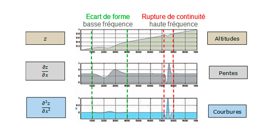 A partir des normales obtenues grâce à la résolution de l’équation générale de la stéréo-photométrie, nous pouvons dériver cette information pour obtenir l’information en courbures. La courbure est une propriété qui décrit le taux de changement de direction d’une courbe, ou d’une surface dans une direction donnée. Le schéma suivant illustre l’intérêt d’obtenir une estimation des pentes et des courbures à la surface. En effet, l’œil humain est très sensible aux discontinuités de forme d’une surface. Ces variations se traduisent en termes de pentes par une variation locale forte, et en courbures par des intensités en courbures importantes à l’endroit des anomalies. Dans l’information de courbure, on constate que la forme de la surface (la composante basse fréquence) est filtrée, mettant en évidence l’information liée à la micro-géométrie (composante haute fréquence) de la surface, facilitant ainsi la détection des défauts d’aspect !