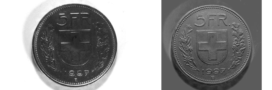 L'image de gauche en mode traditionnel est à comparer avec l'image de droite avec qmtrelief. On voit que les différences de teintes de la pièce sont éliminées et donc que le relief de la pièce est beaucoup mieux visible.