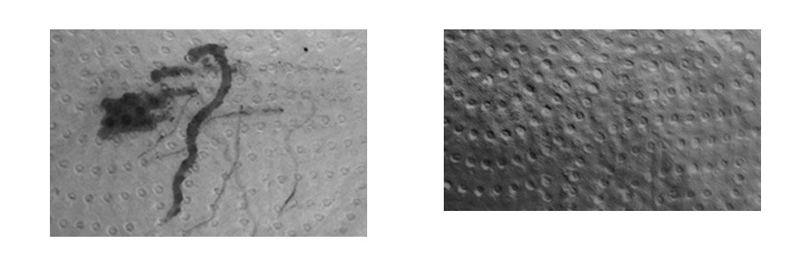 qmtrelief permet un traitement avec une orientation spécifique afin de focaliser la recherche sur des reliefs ayant une orientation spécifique. Dans ce cas on voit l'image avec un traitement orienté pour visualiser le relief d'un décors à comparer avec l'image d ela même pièce avec une recherche orientée à 90 degrés qui permet la recherche de défauts.