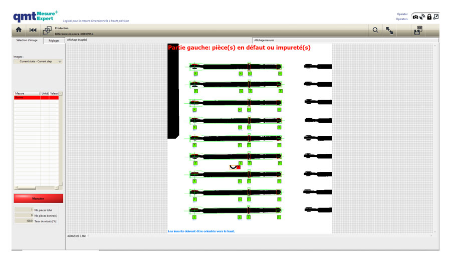 La solution a été réalisée avec le logiciel qmtmesure-expert, il est flexible et ergonomique pour s’adapter précisément aux besoins du client. . Un écran tactile présent sur la machine permet à l’opérateur de connaitre l’état des différentes pièces, de changer de référence et de guider celui-ci dans les différentes actions à réaliser.