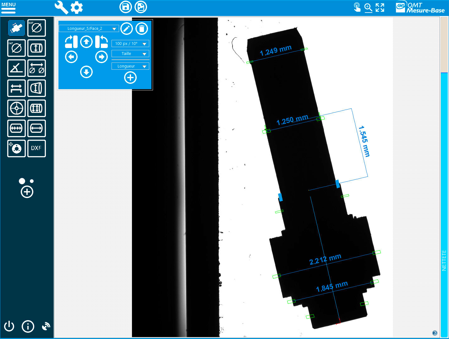 Le qmtprojector-100 possède un système optique qui acquiert l'image de tout le champ de vision à très haute résolution et en une prise d'image. L'image de la pièce est donc visible et rafraichie en permanence, dans le même temps toutes les mesures sont réalisées et affichées.