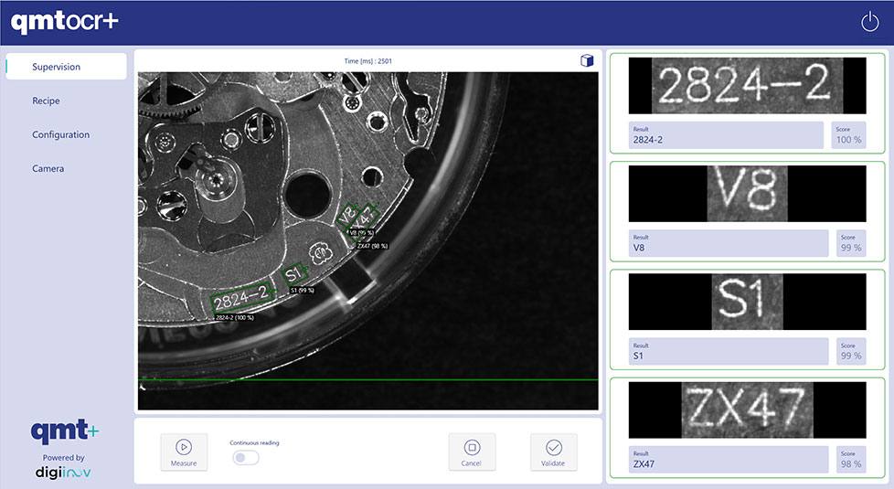 Le module DigiOcr intégré dans le logiciel qmtocr est spécialisé pour l’horlogerie. Cet algorithme Deep Learning de lecture de caractères est entraîné sur plusieurs milliers de polices et il est complété par un traitement spécifique pour robustifier et faciliter son utilisation en milieu industriel. Un réentrainement du coeur est possible pour une adaptation aux cas particuliers